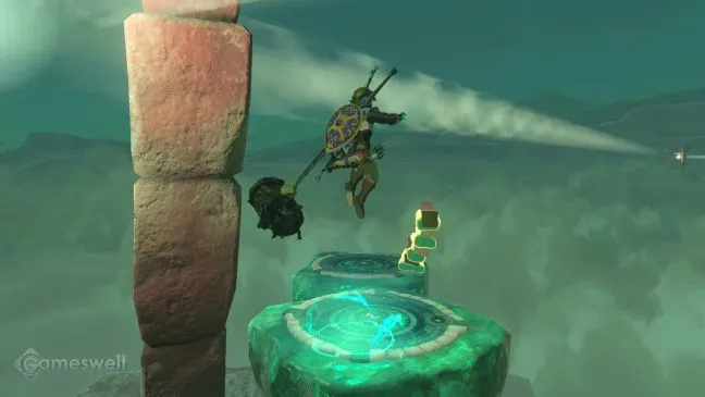 Приклейте деревянные балки к парящему камню с помощью Ultra-Hand. Затем ударьте по обоим парящим камням, чтобы они приняли свою функцию и расположились высоко над вами в воздухе. С помощью потолочного прыжка перепрыгните через один из этих потолочных камней и приземлитесь на его вершину. Затем с помощью ультраруки переместите другой камень еще выше, прихватив с собой деревянные балки.