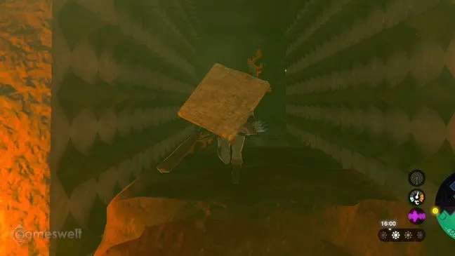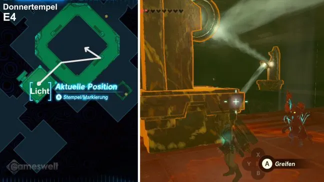 Пусть восходящий поток в центральной комнате храма поднимет вас на четвертый этаж (E4). Там встаньте с той стороны, откуда из щели льется свет, и посмотрите на один этаж вниз.