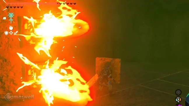 Бегите прямо, пока не окажетесь в коридоре за углом справа, где огнеметы не позволят вам пройти дальше. Осмотрите стены. В одной из стен Вы увидите два хорошо заметных незакрепленных камня. С помощью ультраруки открепите их от стены.