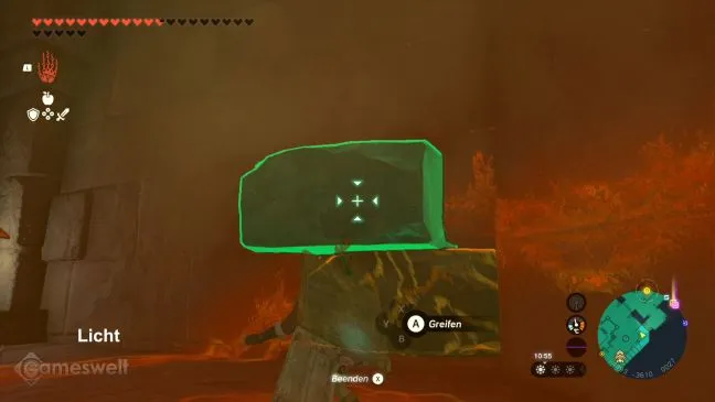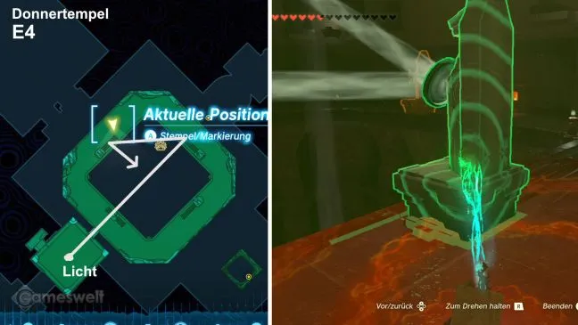 На северо-западной стене также переместите зеркало так, чтобы свет был направлен вверх под углом. Таким образом, свет попадает на отражатель на пятом этаже (E5).