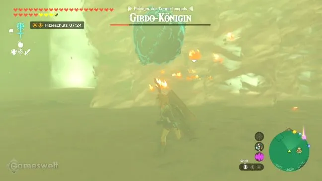 Здесь, на верхнем этаже, находятся четыре гнезда Гибдо. Здесь же вы найдете кокон, похожий на тот, который вы разбили перед Храмом Грома. Зарядите Близкрафт Риджу и выстрелите в кокон Стрелой Молнии, чтобы начать бой с Королевой Гибдо.