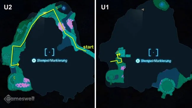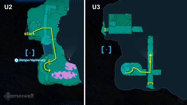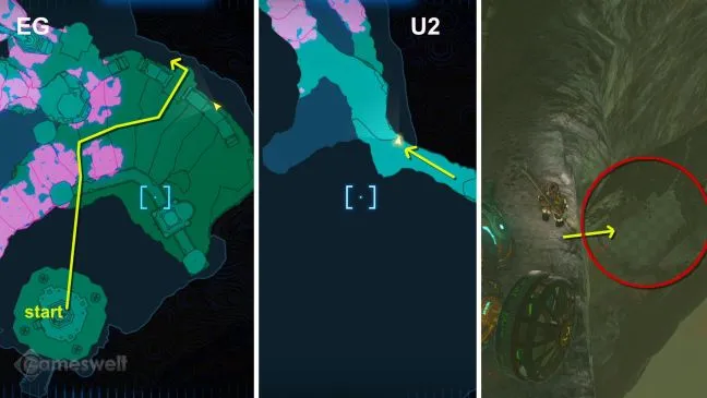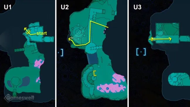 Третья цель снова находится в подвале 1 (U1) на западной стороне. Выйдите из здания библиотеки и по скалам поднимитесь на открытое пространство, чтобы попасть на подуровень U2. В подуровне U2 полностью обойдите северную часть плавучего острова. Вы пройдете мимо святилища Зертаб-матс. Если вы еще не сделали этого, то сейчас самое время это сделать. Прохождение этого святилища можно найти на нашей странице, посвященной святилищам на равнинах Хайрула.