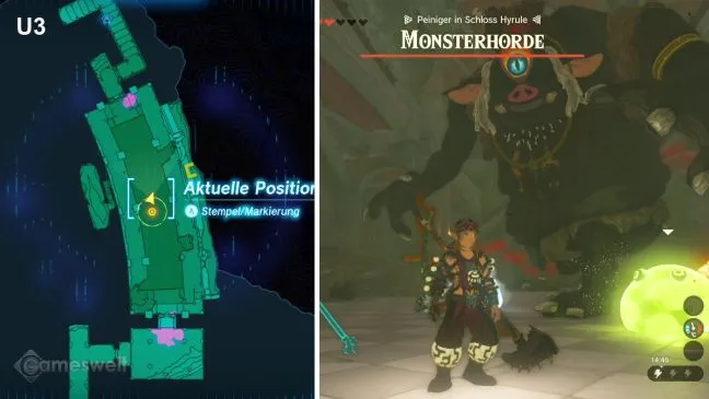 Следующая цель снова находится в U3. С западного балкона в покоях Зельды спрыгните вниз на крепостную стену. Затем держитесь правее и спрыгните вниз к ящерице-фоссу, стоящей на страже у водопада в маленькой области. Зачистив его, пройдите немного на северо-запад и спрыгните вниз к входу в замок, расположенному далеко снаружи.