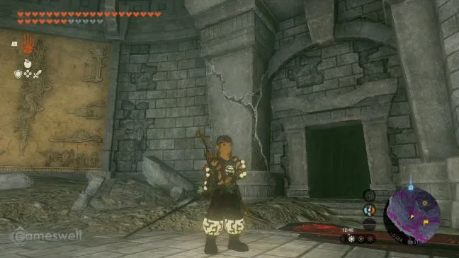 Пройдите по тропинке вглубь фундамента и столкнитесь с врагами (моблинами и гибдонами). Уберите мягкий камень в арочном проеме и продолжайте путь, пока не доберетесь до камеры из вступительного ролика. Держитесь правее и разрушьте мягкий камень в восточном направлении, чтобы открыть небольшой проход.