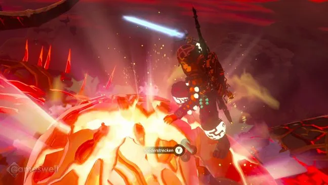 Ваша цель - четыре красных светящихся нароста на его спине. Эти отвратительные горы слизи, из которых выглядывает множество глаз, являются его слабым местом и могут быть уничтожены мастер-мечом. Они выдерживают всего несколько ударов.