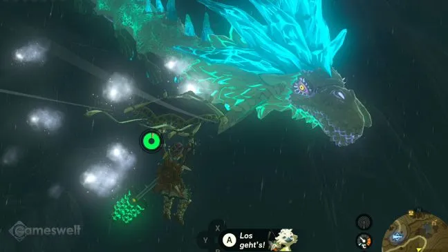 Как видите, все драконы пересекают траекторию полета Зельды. Зельда относится к вам с пониманием и не наносит никакого вреда, когда вы встаете на ее тело. Поэтому вы можете не усложнять себе стратегию подхода, найдя удобное место для приземления на спину Зельды, а затем переключиться на другого дракона.