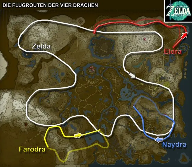 Белый дракон (т.е. Зельда) всегда остается в верхнем мире и прочерчивает большую дугу через все государства. Поэтому Зельду легко достать со всех башен карты, когда она пролетает мимо. Три других дракона, напротив, надолго перемещаются в подземный мир, где поднимаются и спускаются через пропасти.
