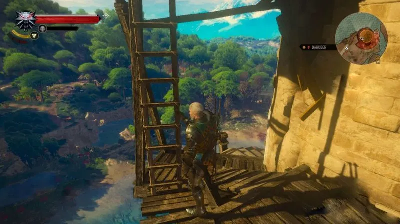 Далее вам предстоит сразиться с ведьмой и первым делом убрать ее с неба. Подготовьте заклинание защиты Квен и нацельтесь на ведьму из арбалета. Стреляйте в нее до тех пор, пока не пробьете ее щит и она не упадет на землю после очередного попадания. Если ведьма нападет на вас в промежутке, обновите заклинание защиты Квен и при необходимости исцелите себя.