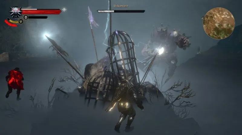 Далее вам нужно будет убить облачного гиганта, которого вы сможете легко уничтожить с помощью хитрости. Встаньте рядом с одной из клеток и уклоняйтесь от атак противника, перекатываясь из стороны в сторону. Если гигант прыгает и погружается в землю, катитесь по кругу, пока он не появится в другом месте и его атака не будет пропущена. Следите за клеткой и подманивайте к ней гиганта, если она заряжена электричеством из-за удара молнии. Подождите, пока гигант нанесет удар, и уклонитесь, как обычно. После этого ваш противник должен случайно коснуться клетки, после чего он на несколько секунд становится беззащитным и может быть избит.