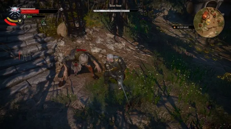 Волк очень сильный и очень ловкий, но вы можете использовать колодец как укрытие и постоянно бегать кругами, чтобы держать его на расстоянии. Никогда не атакуйте его без активного заклинания защиты Квен и не выводите его из равновесия взрывом Аард. После этого вы сможете хотя бы нанести один или два удара.