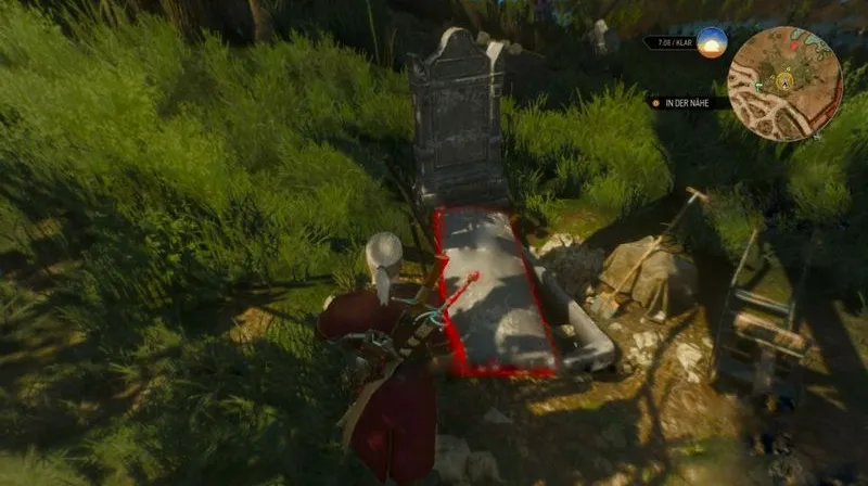 Дойдите до отметки цели и разыщите могилу Моро с помощью своего колдовского чутья. Сначала прочитайте надпись на надгробии, а затем посмотрите на каменную крышку. Повернитесь, снова активируйте свое колдовское чутье и двигайтесь по следам, пока они внезапно не закончатся. Вернитесь к могиле и осмотрите тело Моро.
