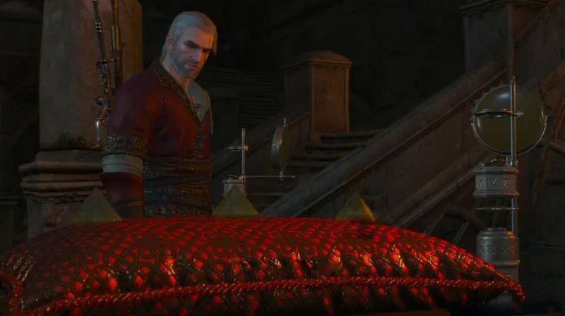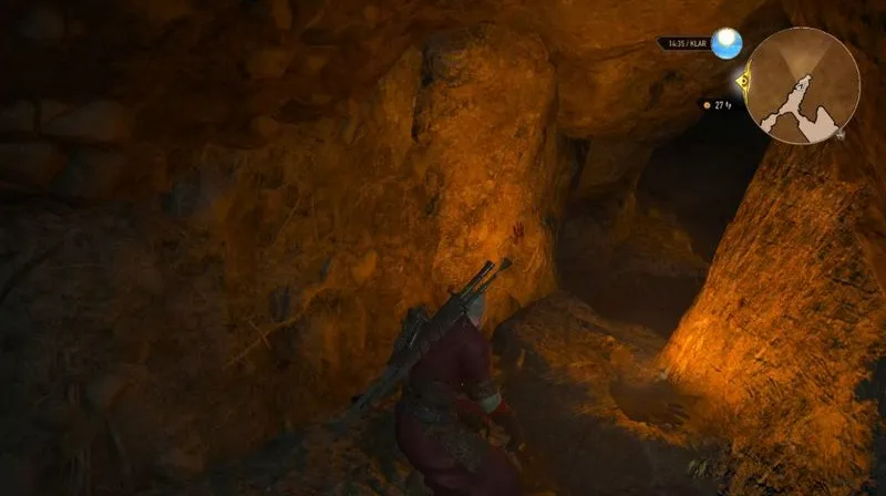 Пройдите к статуе, которая окажется еще одним охранником. Убейте его и войдите в следующую комнату. Посмотрите на опорный столб в центре и найдите веревку, прикрепленную к нему, используя колдовское чувство. Пройдите до конца назад, снова активируйте свое колдовское чувство и осмотрите заблокированный проход. Также найдите четыре камня, выступающие из окружающих стен. Выстрелите из арбалета в одного из них на востоке и активируйте всех остальных взрывной волной Аарда, после чего откроется проход.