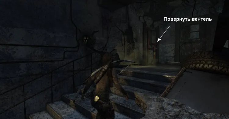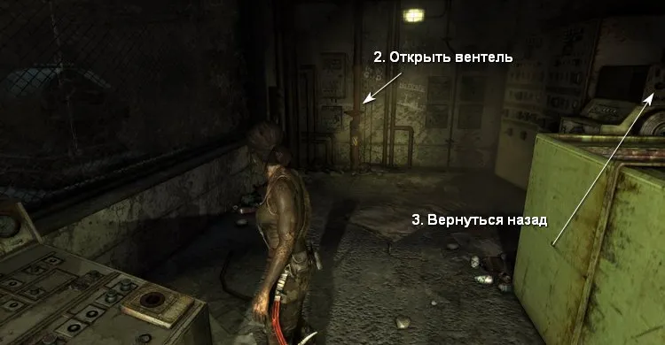 Идём вперед и поворачиваем красный вентиль, чтобы прекратить поток газа. Через дыры в стенах проползаем в следующую комнату и обходим запертую дверь.