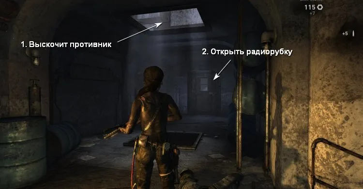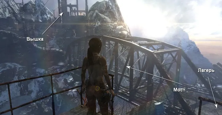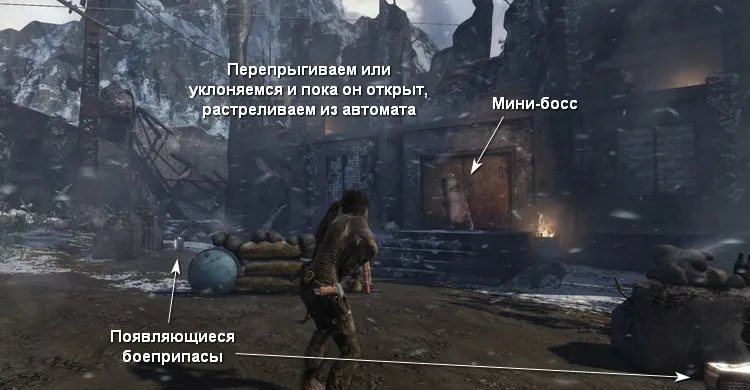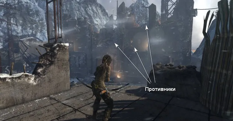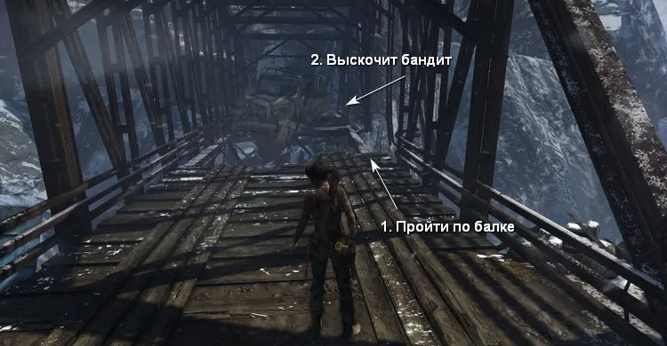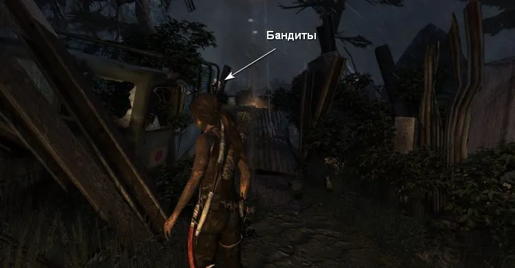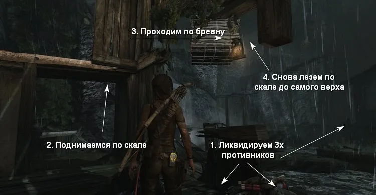На втором этаже убиваем бандитов за стеной справа. Перепрыгиваем в соседние развалины и карабкаемся наверх, чтобы по тросу спуститься в затопленное помещение.