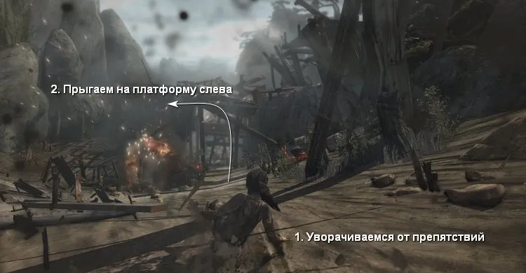 Убегаем подальше от самолета. Затем нам надо спуститься по крутому склону, уклоняясь от всех обломков, камней и деревянных кольев.