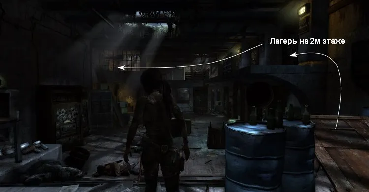 Прыгаем на второй этаж, бежим вдоль стены и поворачиваем налево, чтобы устроить лагерь.