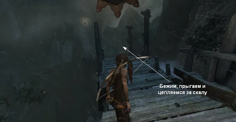 Быстро пробегаем по мосту, который сломается под нами и цепляемся за противоположную стену.