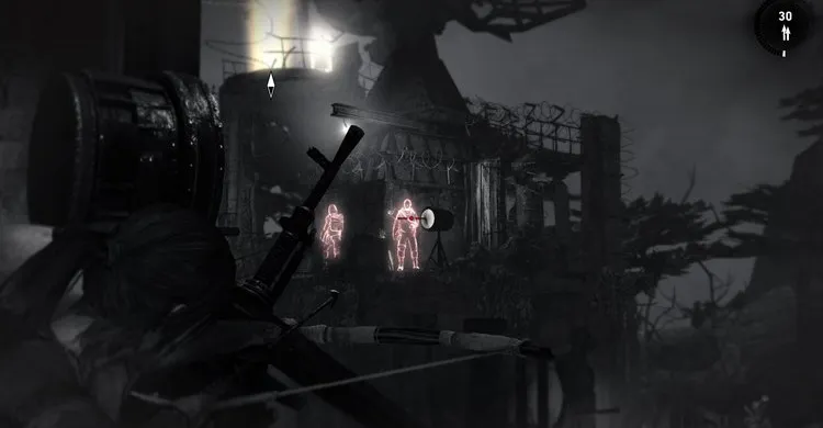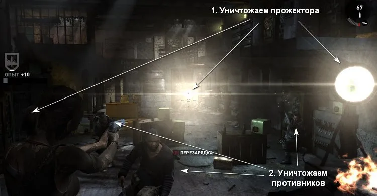 Впереди ожидает толпа врагов, которая ослепит нас ярким светом от прожекторов. Время замедляется, и мы можем расстрелять всех бандитов из автомата. Не забываем стрелять в прожектора, чтобы разбить лампы внутри, и улучшить видимость.