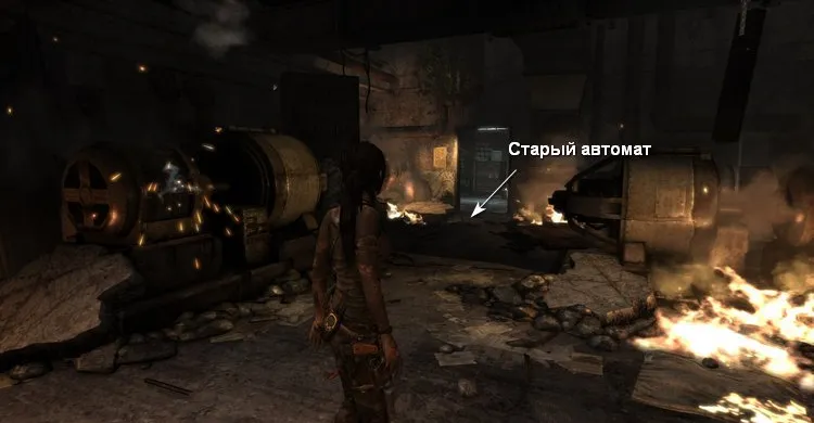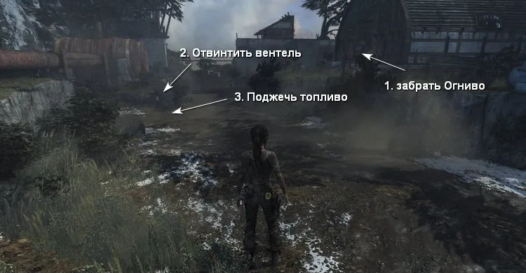На земле увидим огромные топливные баки, обходим их и осматриваем склад, внутри лежит Огниво. Откручиваем вентиль, чтобы вылить немного горючего и взрываем цистерны.