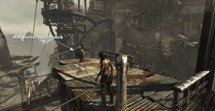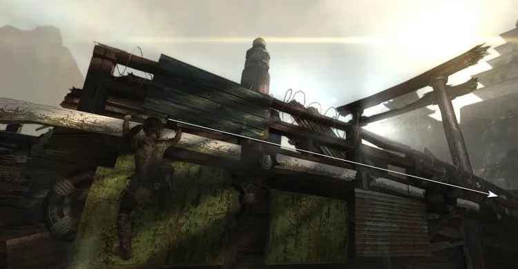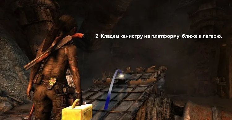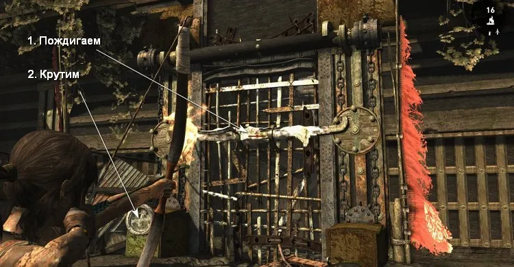 Выпускаем комету в грузовой отсек вертолёта, чтобы вырвать дверь. Заходим внутрь и осматриваем кабину. Лара находит аптечку, но необходимые лекарства закончились и бинтов тоже нет. В кабине пилота находится труп, а в его куртке спрятана рабочая Зажигалка. Накаливаем стрелу и прижигаем рану. Однако, польза зажигалки на этом не заканчивается, потому что её можно прикрепить к луку и стрелять Огненными стрелами.