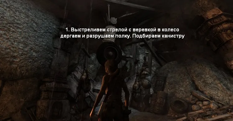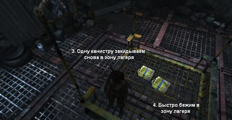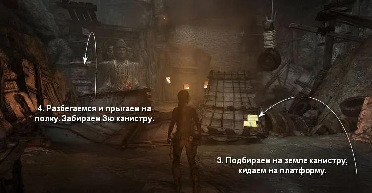 - Забираем 4 желтых канистры, разрушив полки под ними. Чтобы сломать полку в правом углу, надо раскачать колесо от самолёта и направить его в сторону канистры. Затем закидываем все канистры на полку рядом со статуей, чтобы она сломалась от большого веса.