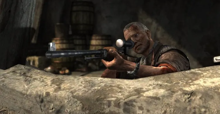 За большой аркой перед гробницей попадаем в ловушку. Быстро стреляем в блок, чтобы освободиться. Затем убиваем бандитов, пытающихся схватить нас.