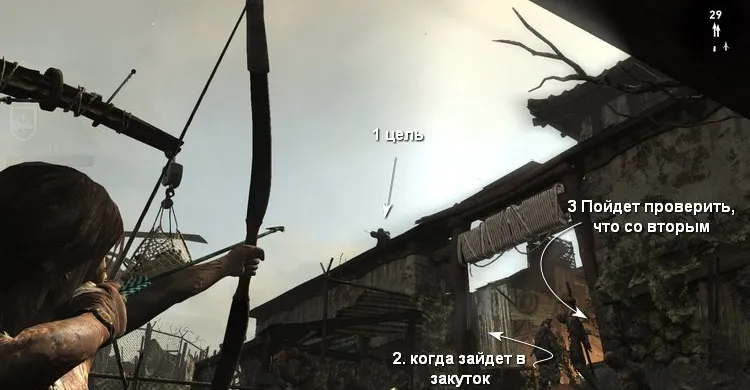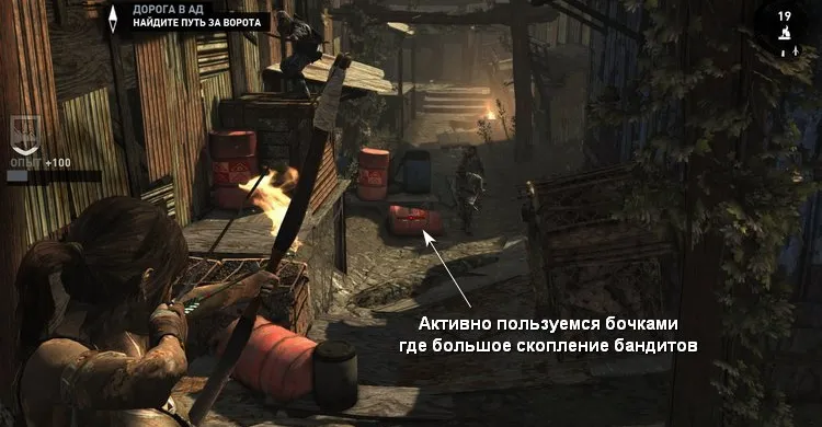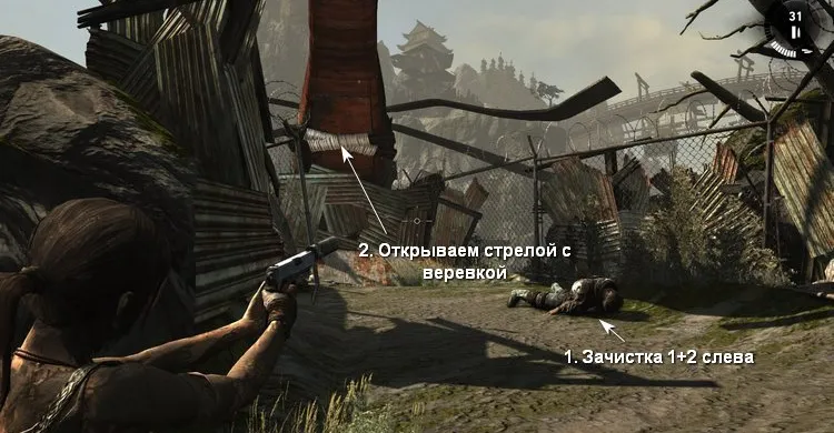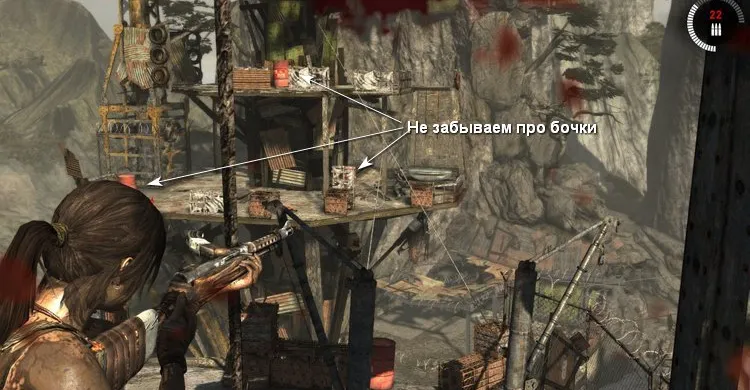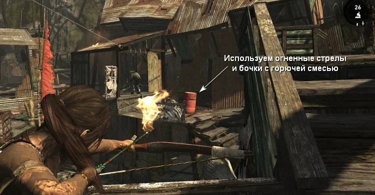 Рядом с вертолётом патрулируют враги. Поскольку у Лары сейчас очень мало здоровья, стараемся не подставляться под выстрелы. Забираться на крыши мы не можем, поэтому аккуратно обходим постройки и зачищаем территорию перед вертолётом.