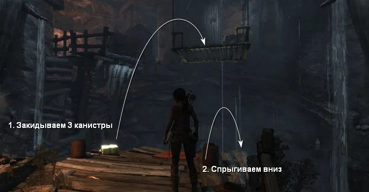 - После того как платформа опустится, наступаем на нее и выкидываем одну канистру.