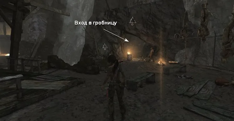 По тросу поднимаемся наверх и подбираемся ближе к канатной вышке. По пути отстреливаемся от бандитов. Слева в пещере находится гробница.