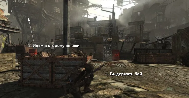 За воротами находит продолжение трущоб. Осматриваем локацию и спускаемся к маленькому грязному озеру. Внизу услышим бандитов, которые пытаются поймать сбежавшего пленника по имени Грим. Направляемся к нему навстречу.