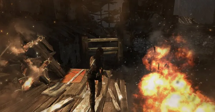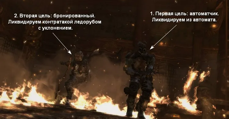 Выбираемся из пещеры и сразу же попадаем в крепость. Все дома и постройки охвачены пожаром из-за катастрофы, случившейся в пещере. Вокруг горят бандиты и просят о помощи, пробегаем мимо них и при необходимости отстреливаемся.