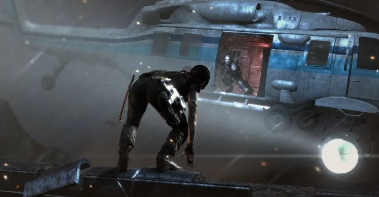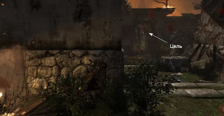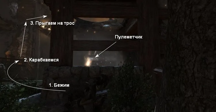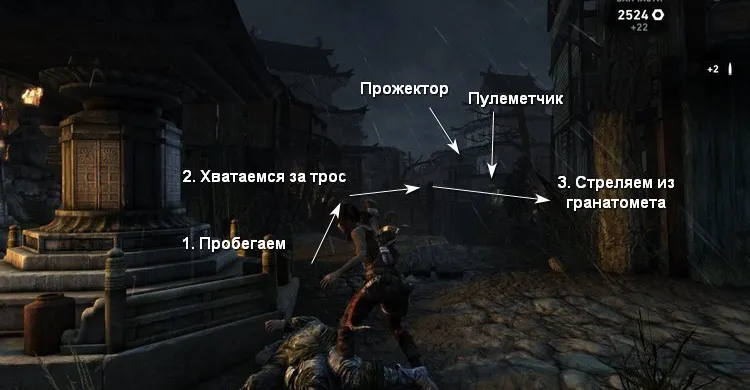 Аккуратно зачищаем территорию, прячась хижине слева. Осматриваем территорию, затем нас ослепят большим прожектором и попытаются убить из пулемета. Поднимаемся на балкон слева и по тросу перебираемся в противоположное здание. Из-за угла целимся в пулеметчика и убиваем взрывающейся гранатой.