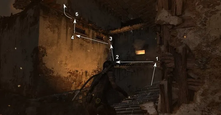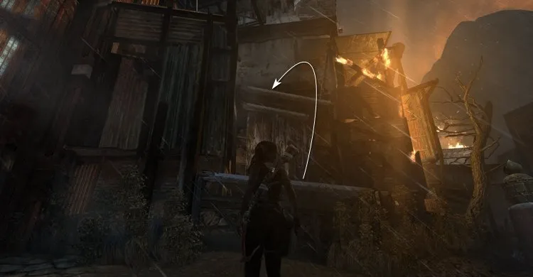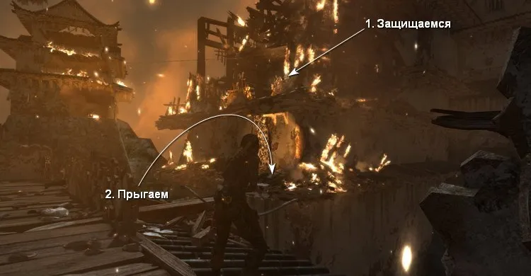 Перепрыгиваем в горящую башню и постоянно забираемся наверх. Цепляемся за каменные стены и балки, чтобы добраться до крыши.