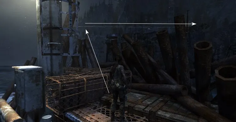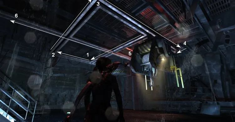 Лару бьёт током и она отскакивает назад. Чтобы освободить путь, необходимо двигать крюк, висящий перед входом. Если тянуть его с помощью Жумара, то он сдвинется вперед или назад, но, чтобы передвинуть его в сторону, придётся залезть на желтые лестницы сбоку.