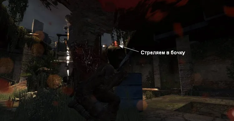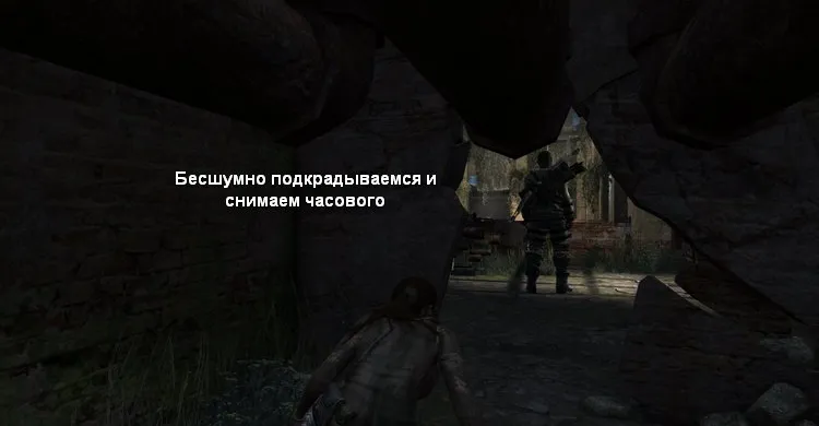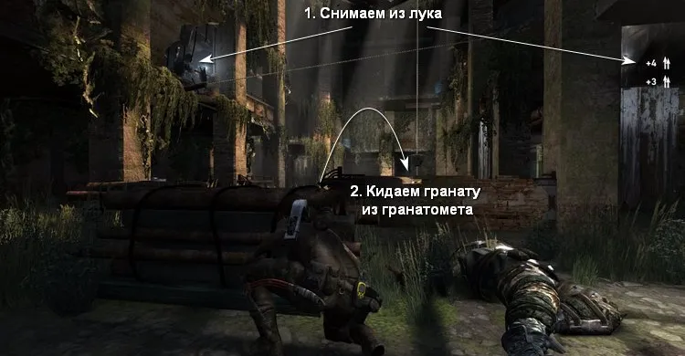 Впереди увидим несколько врагов, первого можно бесшумно убить, подкравшись сзади. Затем выжидаем, когда бандиты достаточно высоко поднимут генератор, и стреляем в крепление над ним.