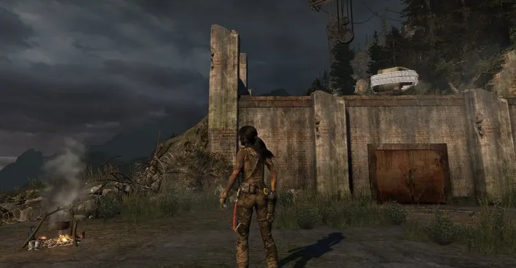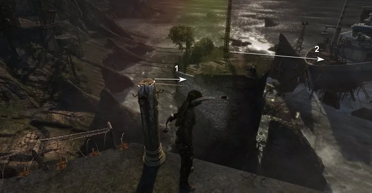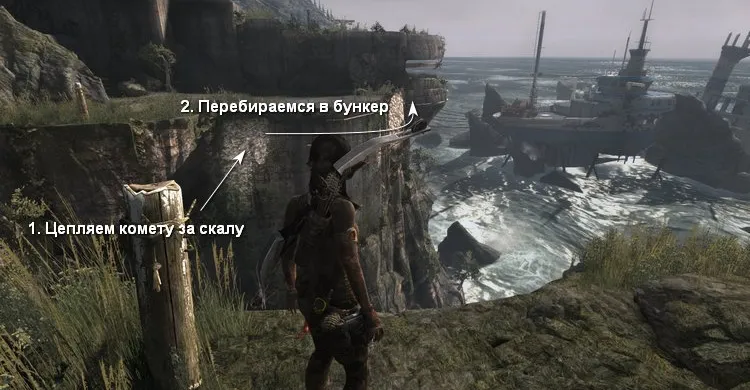 Выходим из заброшенной лаборатории по висячему деревянному мостику и запрыгиваем на балку. Чтобы добраться до противоположного берега и попасть в бункер, нужно выпустить комету в каменную стену и установить трос. Проход под скалой приведет нас к лагерю «Вид на бункер».
