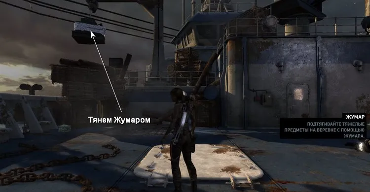 После победы забираем Жумар и тянем к себе обмотанную наковальню, чтобы сломать пол. Через проделанную дыру спускаемся в отсек с каютами.