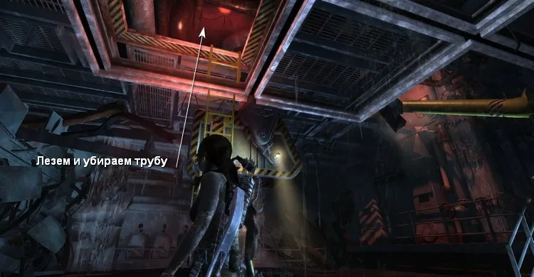 По желтой лестнице поднимаемся под потолок и ногой отламываем трубу, мешающую нам.