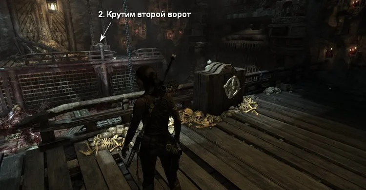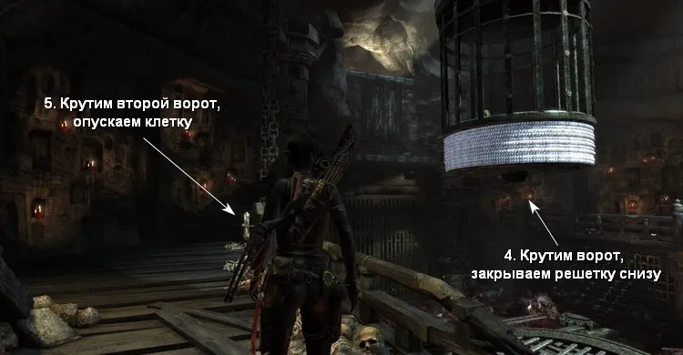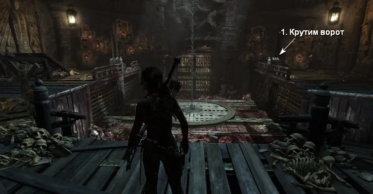 1. Для начала прокручиваем ворот справа. Механизм откроет металлические решетки на полу.