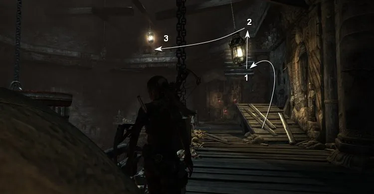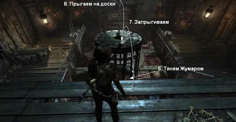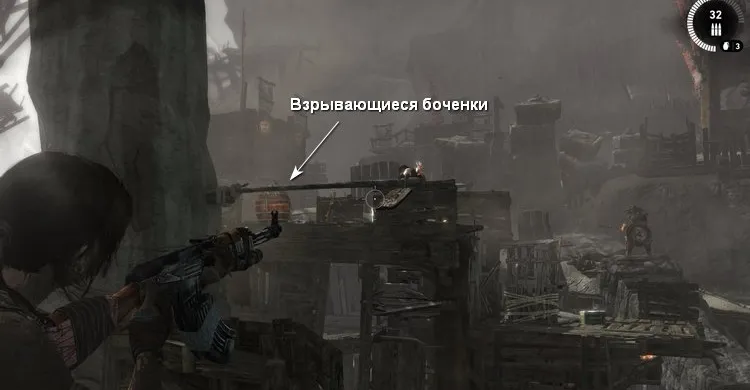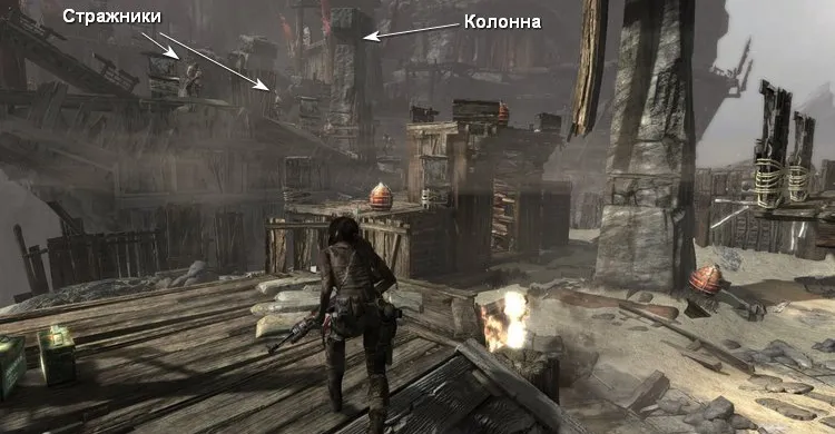 Мост ломается, и Лара падает. Её замечает целая армия стражей, с которыми предстоит сразиться. Сначала нас начинают обстреливать лучники. Они стоят на вышках и выпускают огненные стрелы и снаряды.