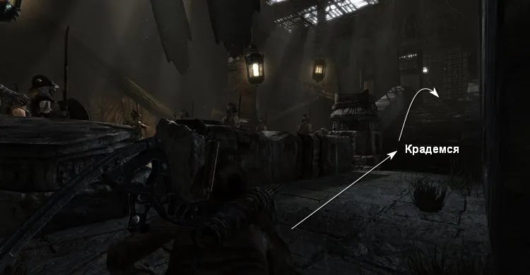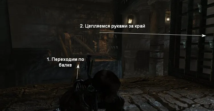 Аккуратно поднимаемся по правой стороне и проходим по балке над врагами. Затем цепляемся за карниз, чтобы попасть в центр зала.