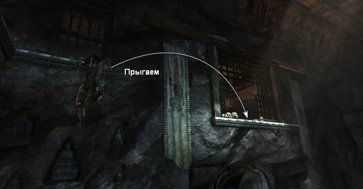 В конце мы должны перехватиться за следующий карниз, но зацепим черепа, которые упадут, и враги обнаружат нас. Быстро залезаем в небольшое окно.