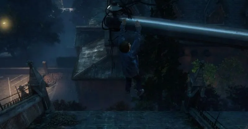 Следуйте за Сэмом и спуститесь по крыше. Держитесь левее и спрыгните, как только достигнете дна. В последний раз перемахните через дорогу с помощью веревки. Вы попадете на небольшой балкон. Сэм следует за вами, и вам придется спуститься по лестнице на дорожку.
