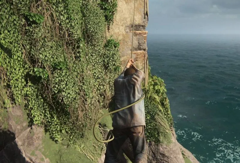 Возьмите свой скалолазный крюк и выбросьте его. Перекатитесь по канату на следующую платформу. Затем пробегите дальше по тропинке и повторите у следующей балки. Спрыгните с вершины и приземлитесь на деревянный настил, встроенный в стену. Поднимитесь так, чтобы оказаться на плато.