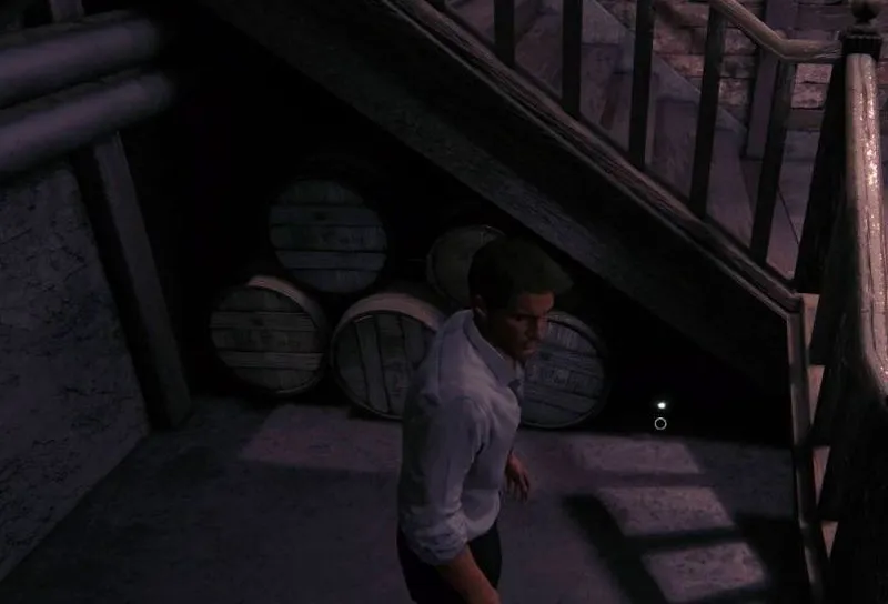 На втором повороте бегите вправо и тяните большую винную бочку на себя, пока не сможете пройти дальше. За ним находится еще одна винная бочка. Потяните к себе и эту винную бочку. Это откроет комнату дальше. Затем обойдите вокруг бочек.