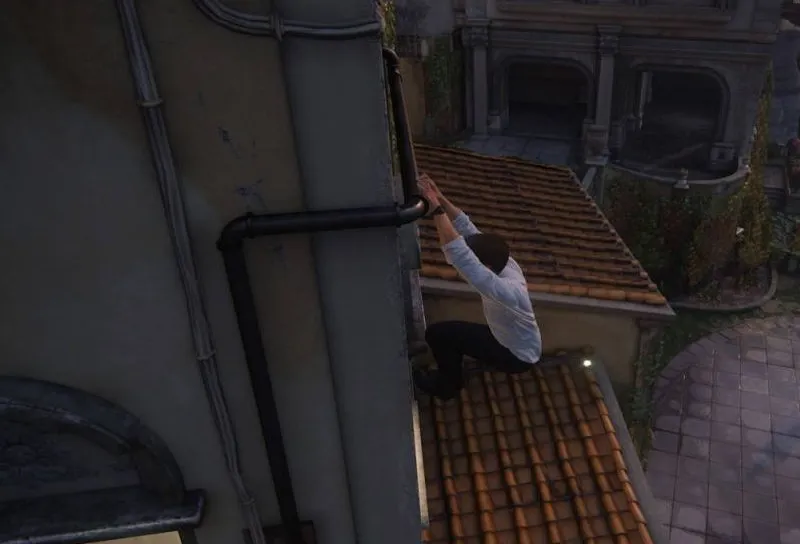 Слева вы увидите балкон. Спрыгните вниз и забегите за угол. Вы обнаружите небольшой балкон с лестницей, ведущей на него. Поднимитесь. На балконе продолжите подъем по зданию, на этот раз по водосточной трубе. Поднимитесь вверх вдоль окон.