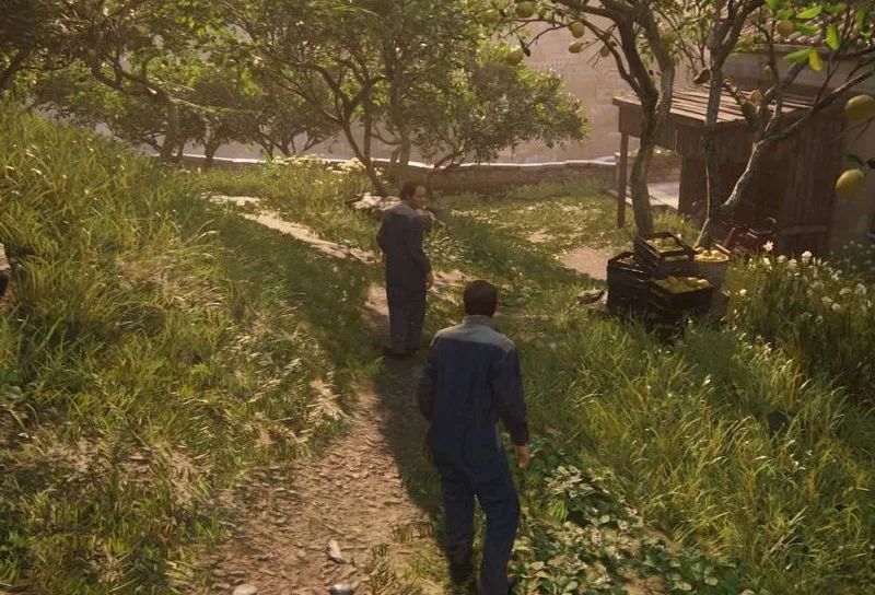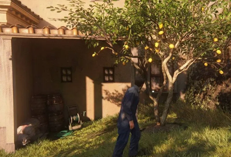 Спрыгните с самой высокой точки и приземлитесь рядом с Сэмом. Подождите немного, пока охранники пройдут. Затем бегите вдоль участка и направляйтесь к небольшому дому. Он находится с правой стороны. Возле этого идиллического домика растет лимонное дерево.