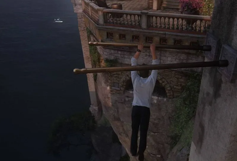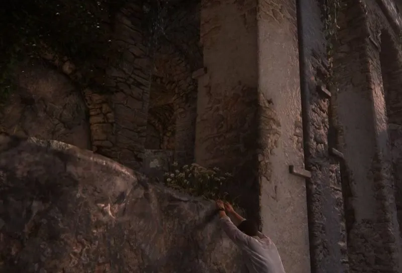 Справа от точки обзора находится большая арка. Натан замечает, что пути наверх нет. Подойдите к арке перед ней и заберитесь на нее с левой стороны. На вершине вы найдете шест на стене, который торчит наружу и может быть использован.