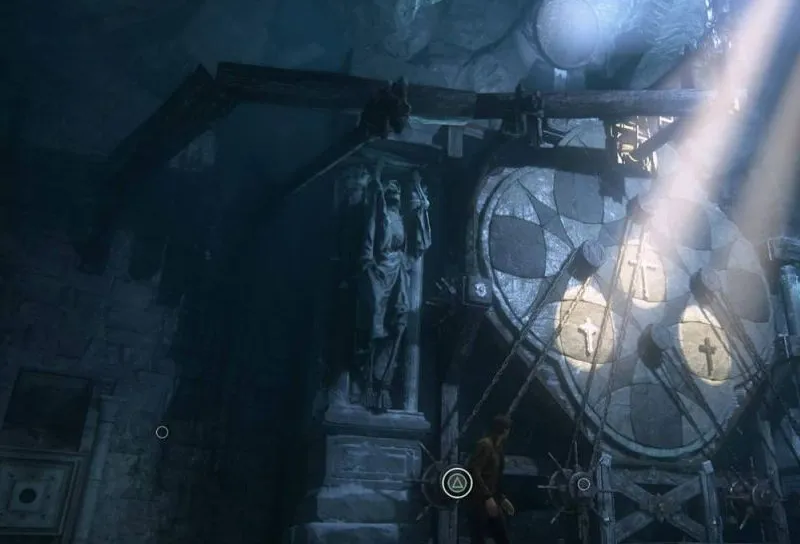 В нише вы найдете маленький сверкающий предмет. Опуститесь на край и продолжайте опускаться вниз, пока не доберетесь до маленького сокровища – часов с черепом Memento Mori. Затем поднимитесь обратно и забегите в другую большую комнату наверху.