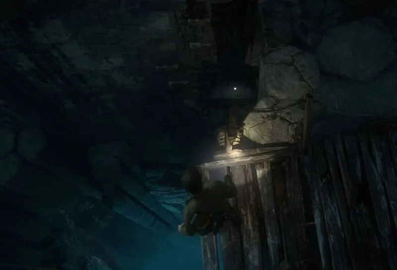 Спуститесь немного вниз и сможете перемахнуть на скалы слева. Справа от платформы вы найдете отверстие в стене. Поднимайтесь вверх, и вы попадете в шахту. Проползите до конца, и вы найдете ящик с колесами под ним.